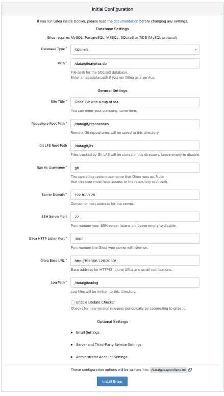 By default, when Gitea runs in a container, it expects an app.ini file to exist under the /data/gitea/conf directory. On first access via a web browser, Gitea presents an initialization screen where you can override default settings and click Install Gitea. This process generates the app.ini file and initializes the database.
