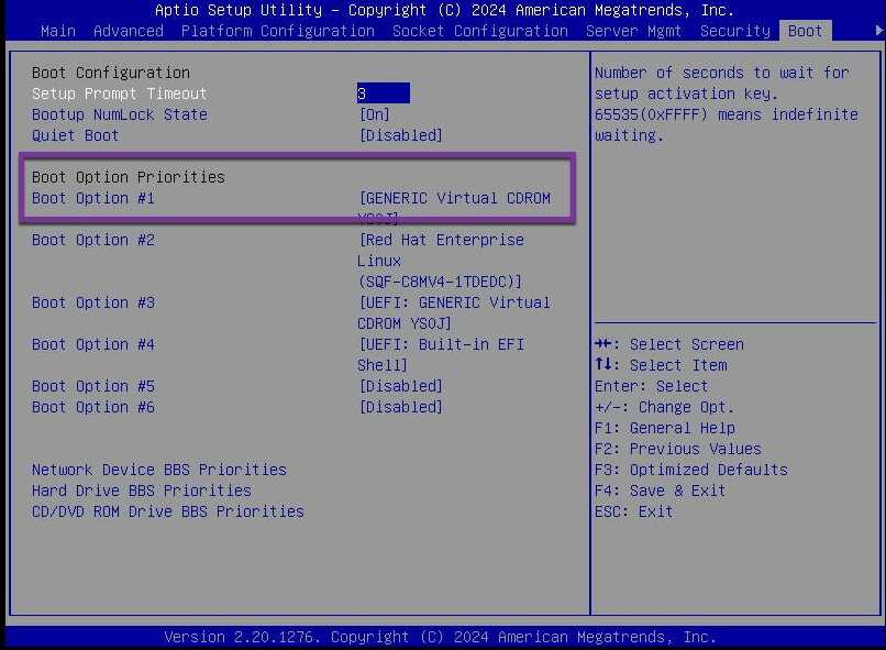 Once the console opens, use the Power Control menu to power on the server. If needed, hop into the BIOS and double-check the boot order — make sure it’s set to boot from CDROM so it picks up the mounted ISO.