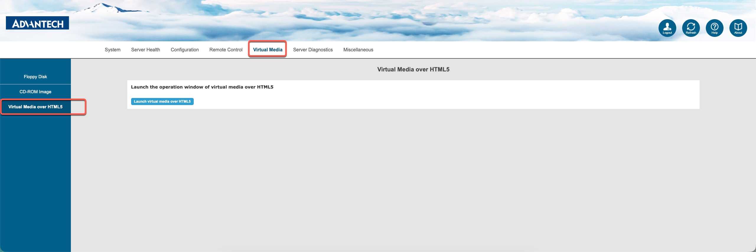 After logging in, find the Virtual Media option in the menu. Since we’ll be installing RHEL remotely, choose Virtual Media over HTML5.